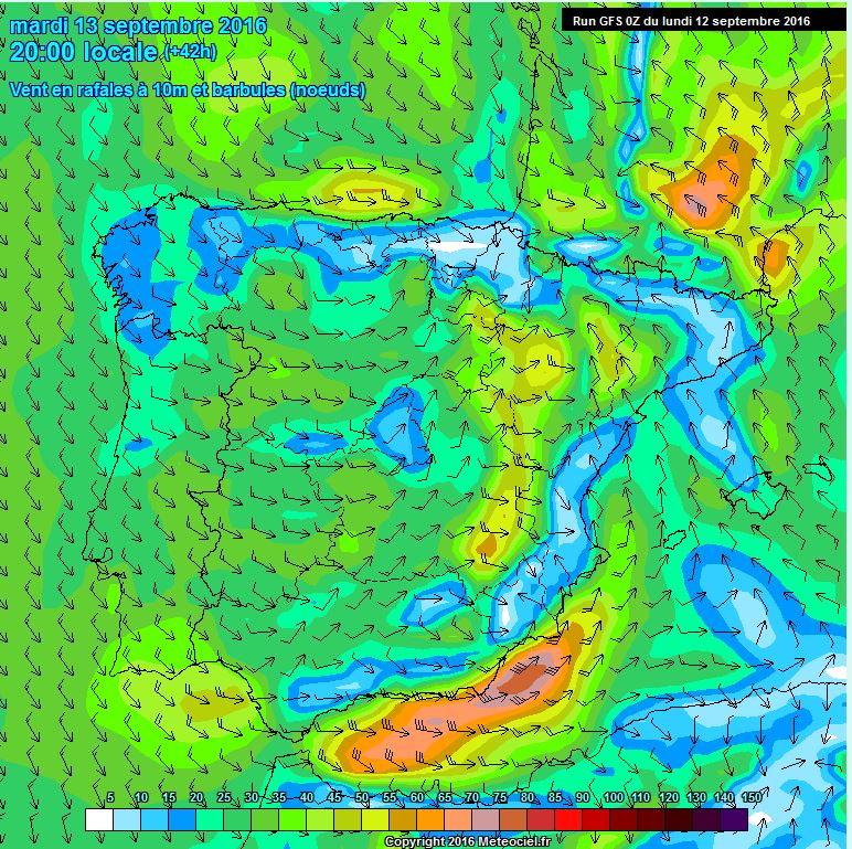 MIÉRCOLES: Vientos de componente oeste, fuertes en el litoral mediterráneo y en Melilla, con rachas muy fuertes en el litoral de Almería. Fuente meteociel.
