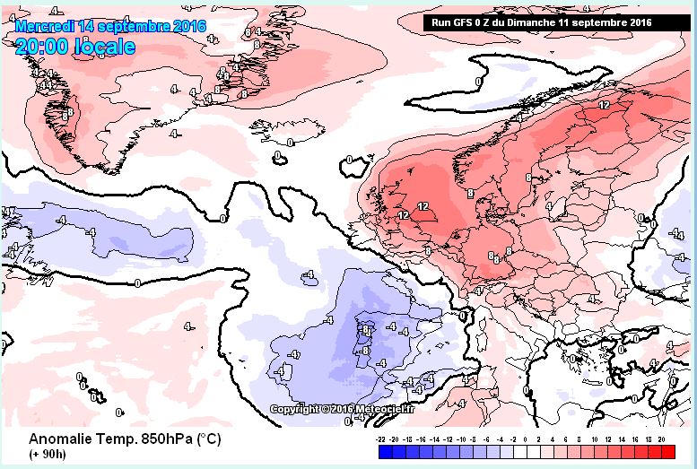 Es curioso que hace pocos dias teníamos encima una masa de aire muy cálido, que no era normal. Pues fijaros como cambia el tiempo en tan poco tiempo jijijiji. La anomalía de temperatura a 850 hpa es impresionante, 8 grados menos. Mientras en otras zonas de Europa la anomalía es positiva, como podéis ver en este mapa. Fuente gfs meteociel.