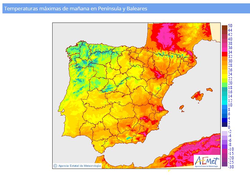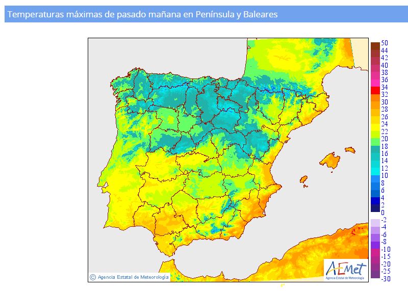 Fijaros en estos mapas de temperaturas máximas previstas desde hoy lunes y hasta el miércoles. En nuestra comunidad y como os he comentado más arriba, notaremos esa bajada el martes a ultima hora de la noche por la zona occidental. Las temperaturas mínimas nos darán un respiro durante unos dias, en Málaga Capital rondaran las mínimas entre los 16 y 18 grados el miércoles, jueves y viernes.