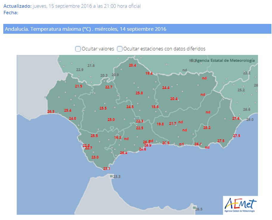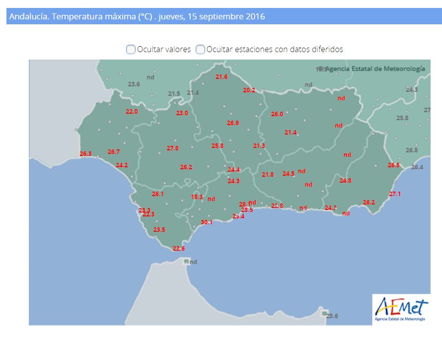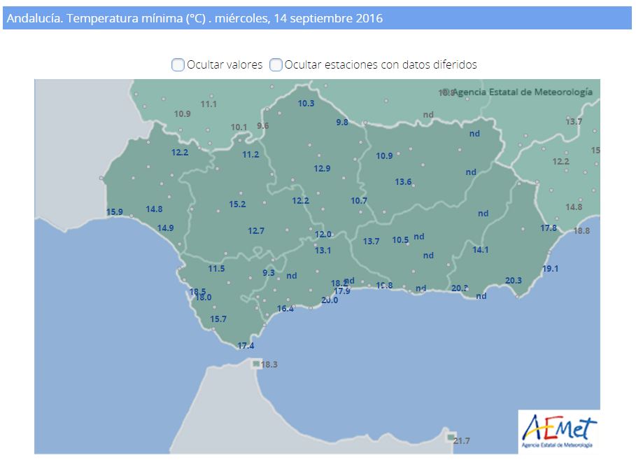 Estos dias las mínimas han bajado mucho en nuestra comunidad, por poneros un ejemplo, Granada Aeropuerto dio ayer 6,8 grados. También destacar que ayer la mínima en Estepona fue de 15,9 grados y la máxima de 30 grados. Esto se ha debido que tanto el miércoles como el jueves ha soplado terral de otoño, y no solo en Estepona, también en Málaga Capital y Vélez Málaga. Os paso las mínimas y máximas del miércoles y jueves.