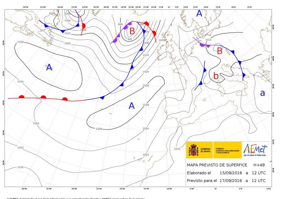 Sobre la previsión del fin de semana poca cosa que contar, simplemente comentaros que los vientos a partir de esta tarde noche tendrán componente este flojo y de dirección variable por el interior. Las máximas subirán  en el Valle del Guadalquivir e interior de Huelva, aquí se sobrepasaran los 30 grados. En el resto de nuestra comunidad serán parecidas o algo más altas. En la zona del litoral malagueño y estrecho pueden ser algo mas bajas debido al levante. Las mínimas subirán en la mayor parte de Andalucía. Os paso el mapa de superficie previsto para mañana. El anticiclón toma protagonismo. Fuente aemet.