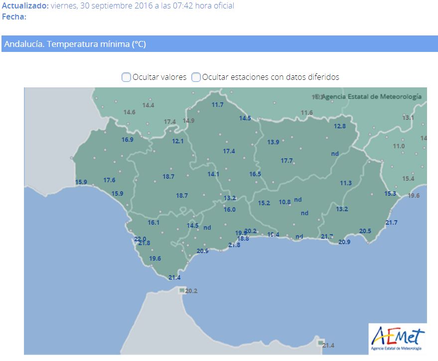 Os paso las temperaturas mínimas que se dan en estos momentos en nuestra comunidad. Destaca Granada Aeropuerto con 10,8 grados.