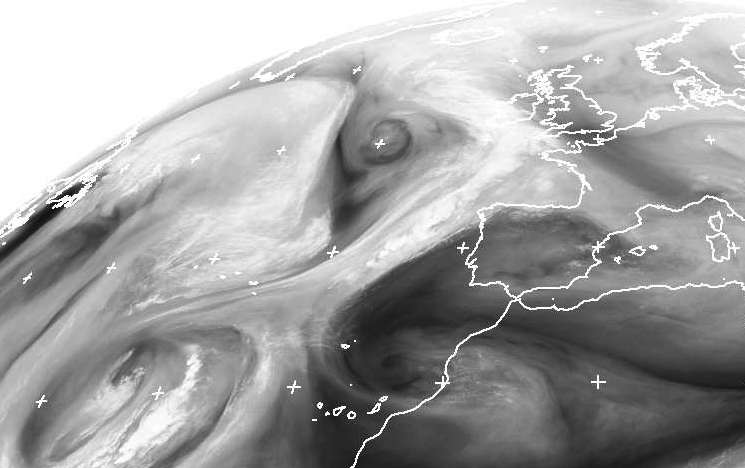 En esta imagen del canal de vapor de agua de Meteosat correspondiente a las 09 UTC de hoy, 11 de octubre, puede verse al noroeste de Galicia, y todavía relativamente alejada la borrasca fría que nos trae el sustancial cambio de tiempo coincidiendo con la festividad del Pilar. Su no muy habitual trayectoria hacia la Península Ibérica viene forzada por el avance de la dorsal atlántica que aparece al oeste de ella.