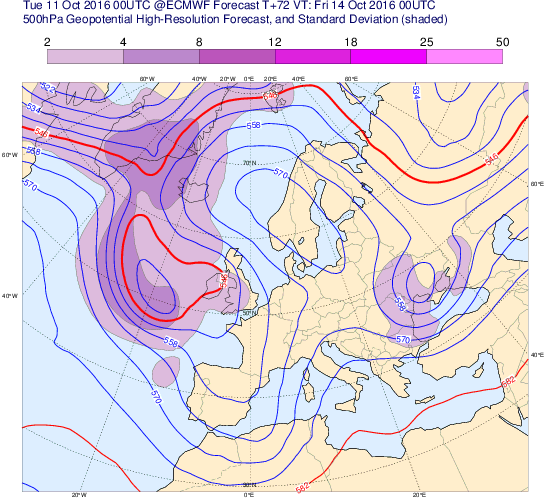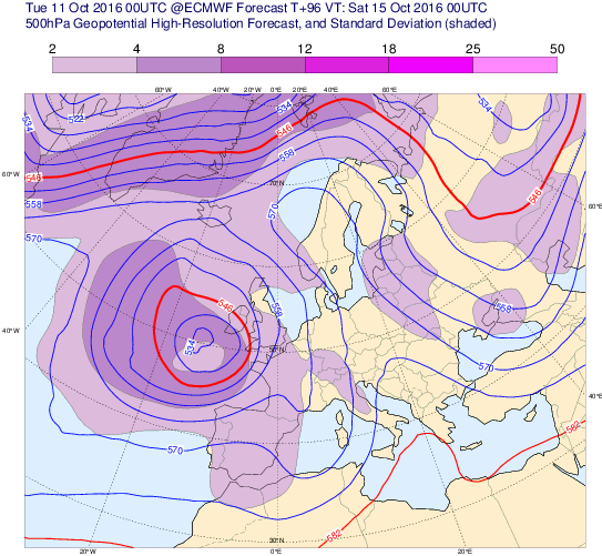Topografía de 500 hPa prevista para la madrugada del 12 de octubre por el modelo del Centro Europeo. La posición de la borrasca fría da lugar a que de forma muy pasajera fluyan sobre la Península vientos del oeste y del suroeste…que de momento no van a tener continuidad. La ausencia de colores morados indica que no existen discrepancias entre el modelo determinista y el probabilístico.