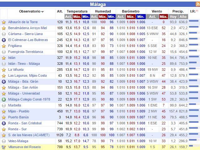 En la zona del Valle del Guadalhorce han tenido que caer buenos litros. Dentro de un rato iré actualizando el blog. Os paso las estaciones de meteoclimatic de la provincia malagueña.