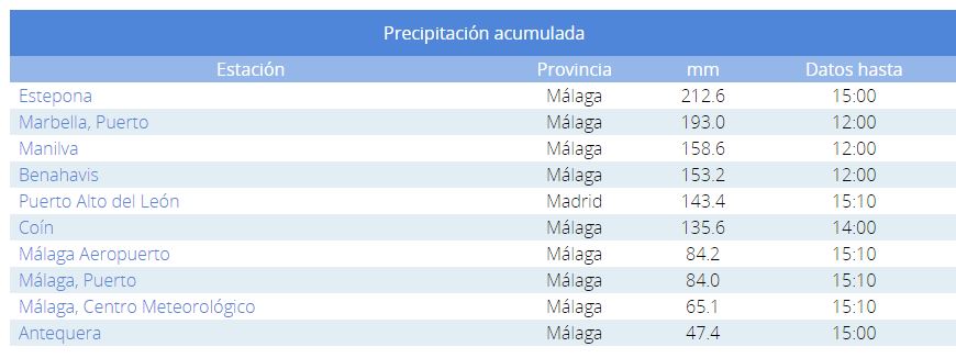 | 29 | EMBALSE DEL GUADALTEBA (MA) | 029P01 | 03/12/16 00:00 – 05/12/16 00:00 | PLUVIOMETRO | 45,60 |
