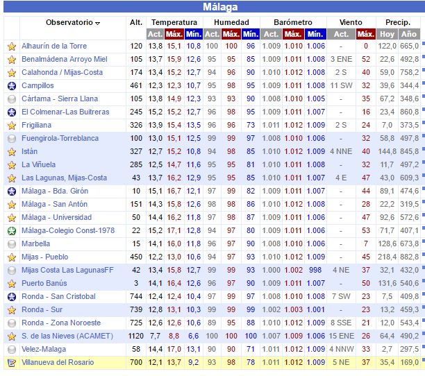 En la zona del Valle del Guadalhorce han tenido que caer buenos litros. Dentro de un rato iré actualizando el blog. Os paso las estaciones de meteoclimatic de la provincia malagueña.