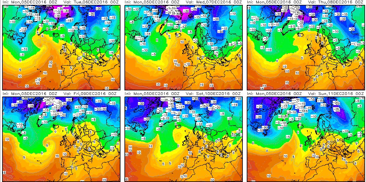 También las temperaturas máximas en buena parte de Europa serán más alta de lo normal para estas fechas. Os paso el panel de temperaturas a 850 hpa.