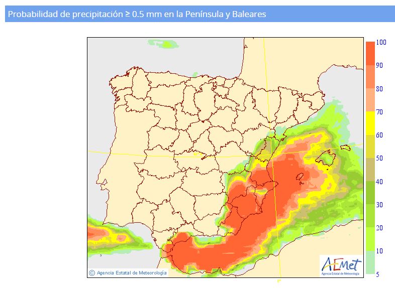 Mañana miércoles el levante soplara con rachas muy fuertes en el Estrecho y Cádiz. Vientos de componente este, flojos en el interior, y con intervalos fuertes en el litoral mediterráneo. La mar de fondo tomara protagonismo en el litoral malagueño. La nubosidad mañana sera más abundante, hay probabilidad de que se den precipitaciones débiles y dispersas en algún punto de el Litoral Mediterráneo y Estrecho. Os paso el mapa de probabilidad de precipitación entre o.5 mm y 2 mm para mañana miércoles en la península.