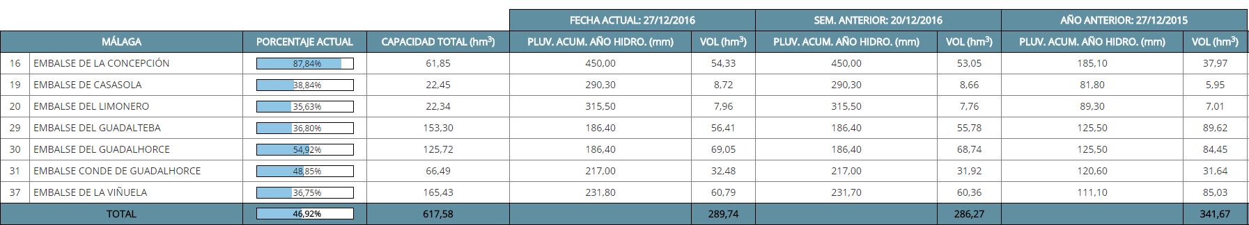 Os paso los datos de los embalses malagueños, aunque ha llovido mas de la media en estos dos últimos meses, el agua embalsada en conjunto es menor que el año pasado en estas fechas. Al dia de hoy hay embalsada 289,74 hm cúbicos, el año pasado 341,67 hm cúbicos. OS DEJO EL ENLACE A LA PAGINA DE LA RED HIDROSUR