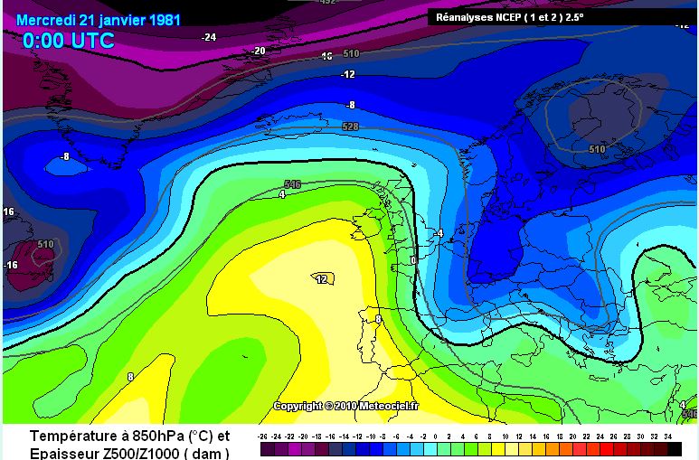 El récord para un mes de Enero esta en 26,8 grados, esto sucedió un 21 de Enero del 1981. En esa ocasión la temperatura a 850 hpa rondaba los 12 grados, os paso el mapa de esa fecha. Fuente meteociel.