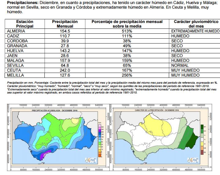 Os dejo con el avance climatológico mensual del mes de diciembre en nuestra comunidad. Como podéis comprobar ha tenido un carácter entre cálido y muy cálido. En cuanto ha precipitaciones ha sido húmedo en Málaga, Huelva y Cádiz, normal en Sevilla, seco en Granada y Córdoba, y extremadamente húmedo en Almería.