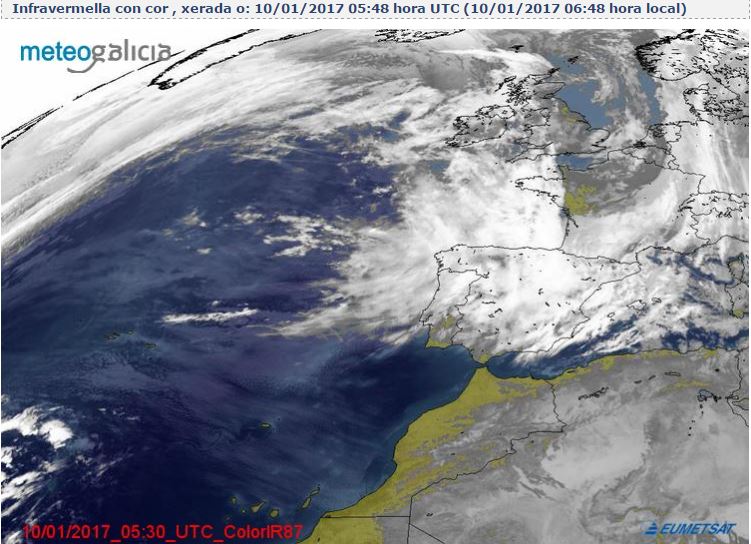 Os paso una imagen del satélite eumetsat y las temperaturas que tenemos en nuestra comunidad en estos momentos. Fuente aemet, meteogalicia.