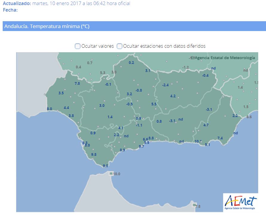 Buenos dias amigos de la meteo, son las siete menos cuarto de la mañana, mi estación en Málaga Capital registra 8,7 grados, y los cielos andaluces en su gran mayoría están con nubes tipo alto, hay probabilidad de candilazo. El viento de terral de invierno es ya protagonista desde primeras horas de la madrugada en la Costa Malagueña, esto hace que la sensación térmica de frío sea mayor. Al mediodía la máxima rondara los 18 o 19 grados en las zonas expuestas a este viento malagueño.