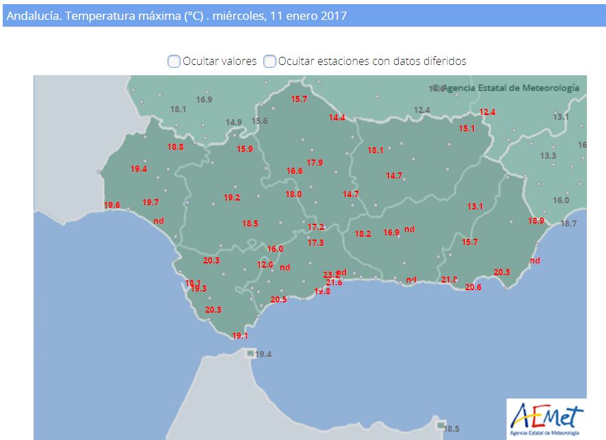 Buenos dias amigos de la meteo, son las seis de la mañana, mi estación en Málaga Capital registra 10,2 grados, los cielos están poco nubosos y sopla una ligera brisa de tierra. No pensaba actualizar el blog hasta mañana, pero hay dos cosas importantes que os tenia que comentar. La primera que al final subieron ayer las temperaturas máximas, pero no tanto como yo esperaba, fijaros en el dato de Vélez Málaga. Temperaturas nada normales para un mes de enero.