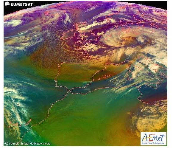Os paso la imagen de masas de aire del satélite eumetsat, donde se aprecia perfectamente como ya afecta al norte peninsular. En esta zona el viento, las olas y la nieve son protagonistas. Fuente meteogalicia.