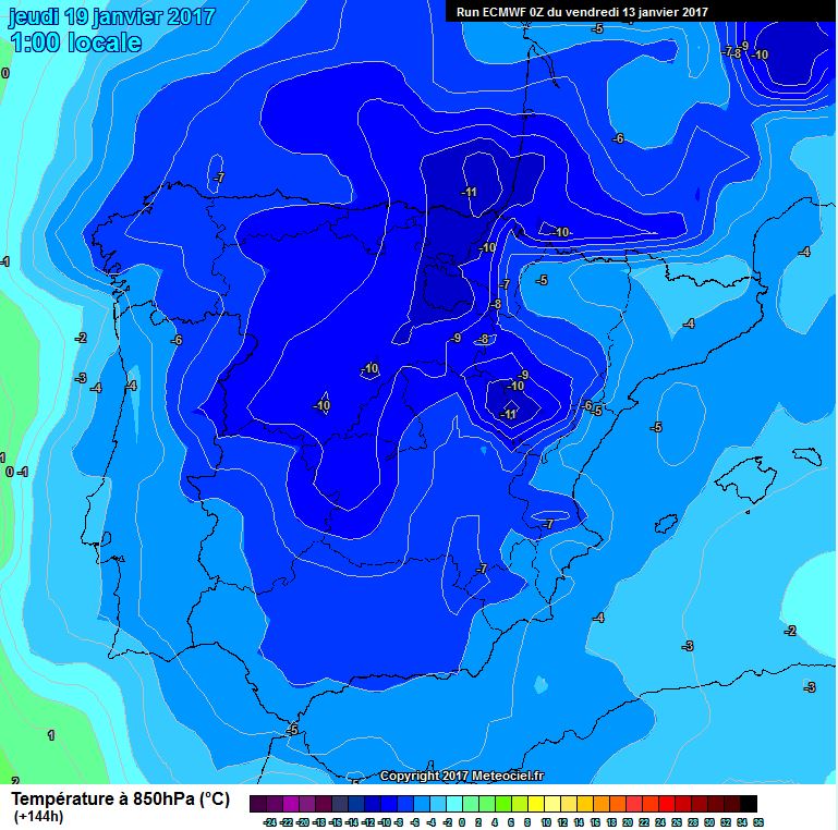 Como os comento en el titulo del blog, a partir del martes hay una probabilidad alta de que tengamos una ola de frío siberiana, que afectaría en primer lugar al noreste peninsular. A nuestra comunidad empezaría a afectarnos a partir del jueves. Al ser continental esta ola de frío es seca. Pero esto lo iremos viendo poco a poco estos dias cuando vaya actualizando el blog. Os paso un par de mapas de temperaturas a 850 hpa ( 1500 metros) previsto para el jueves. En el primero se ve perfectamente el origen de esta posible ola de frío.