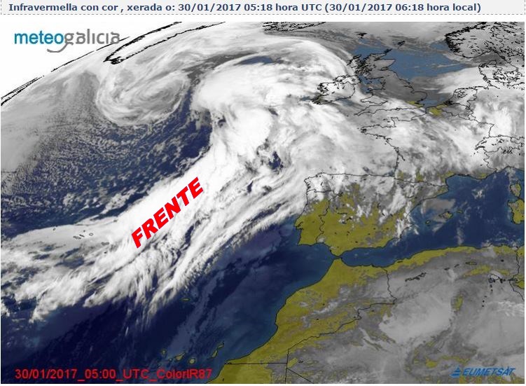 En esta imagen del satélite eumetsat se ve perfectamente el primer frente que afectara durante el dia de hoy a la zona del noroeste peninsular. Os paso la imagen de infrarrojos y el mapa de superficie. Fuente meteogalicia y aemet.