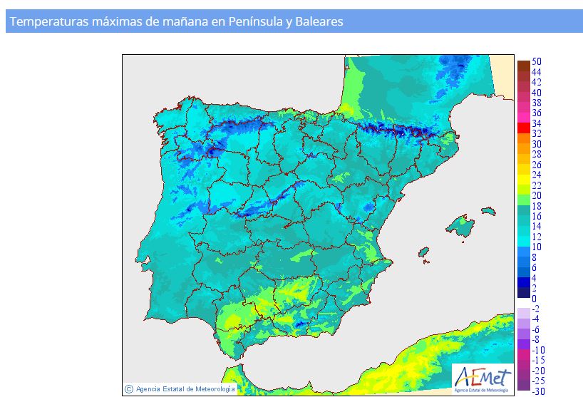 En cuanto a temperaturas previstas para hoy lunes y mañana martes, destacar que las máximas en muchos puntos se acercaran a los 20 grados, incluso en algunos puntos del Valle del Guadalquivir pueden sobrepasarlo. Os paso el mapa de temperaturas previsto para mañana. Fuente aemet.