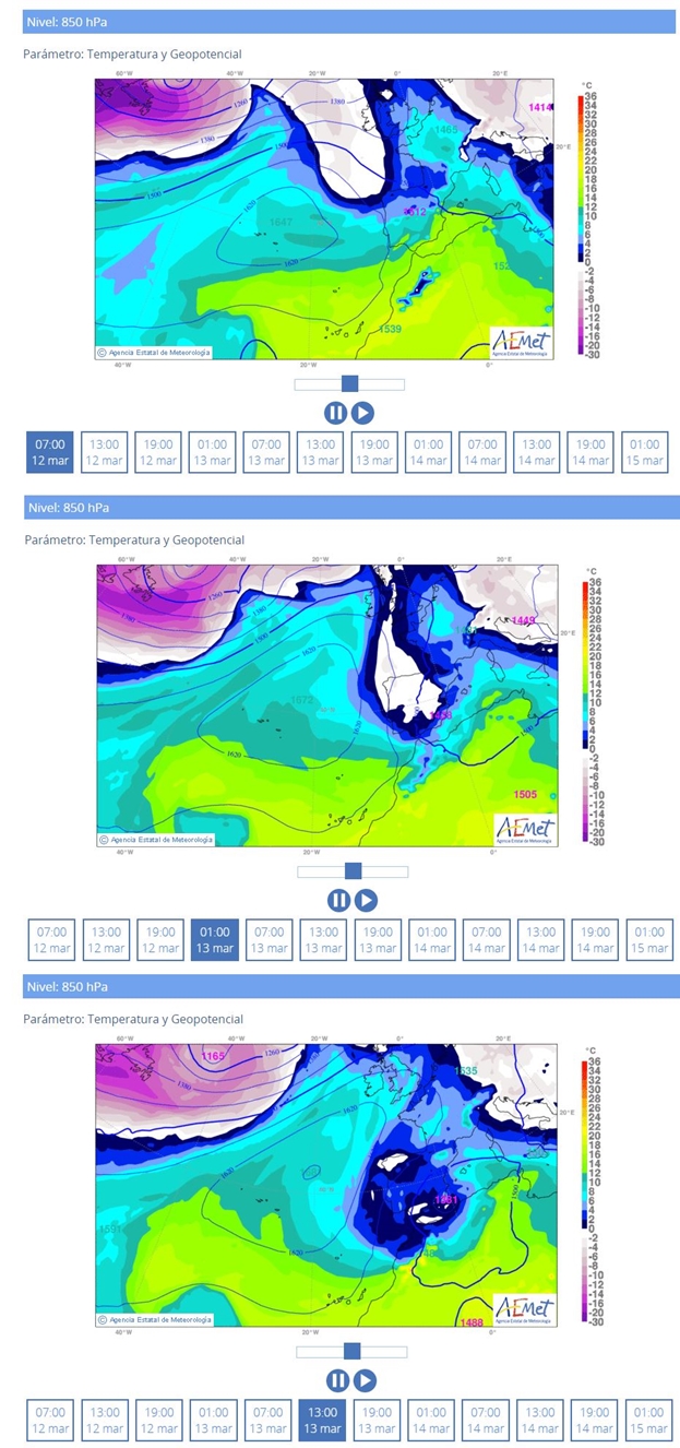 Una pasada ver las temperaturas a 850 hpa ( 1500 metros) que tenemos en estos momentos, y las que se esperan mañana lunes ( el martes se irán recuperando). La imagen de masas de aire es también impresionante, se ve perfectamente esa vaguada de aire frío polar marítimo que ya afecta al norte peninsular. Esa vaguada se estrangulara y formara mañana una dana. Os paso una secuencia de mapas a 850 hpa , y la imagen de masas de aire. Fuente aemet.