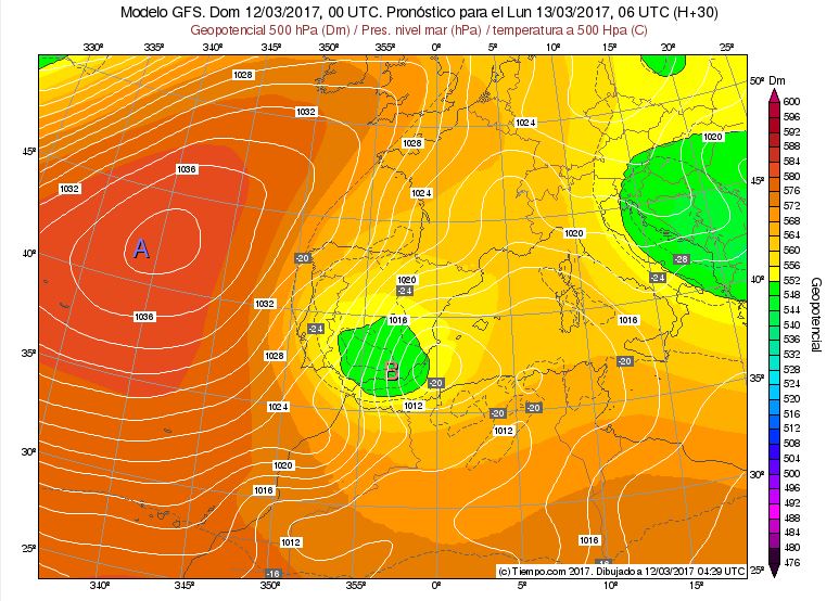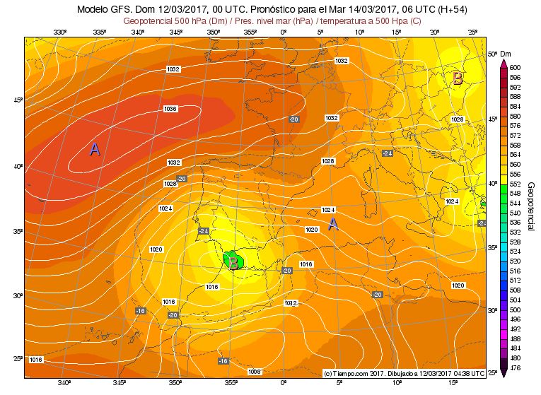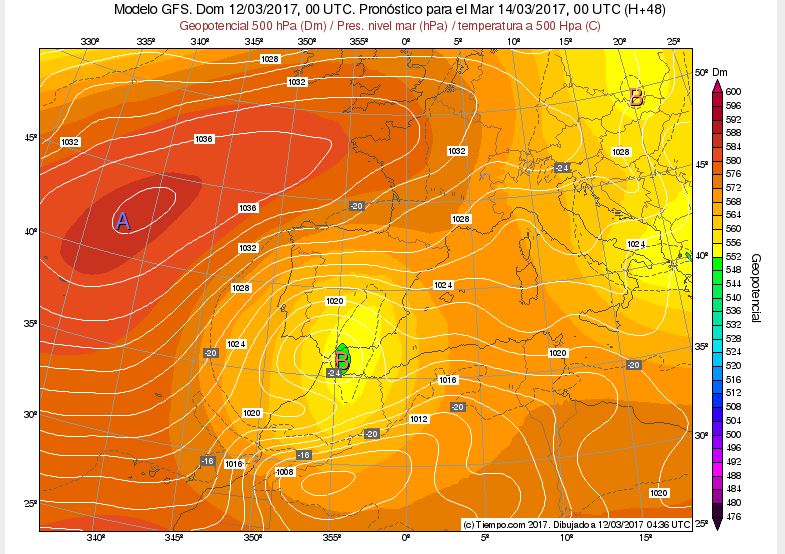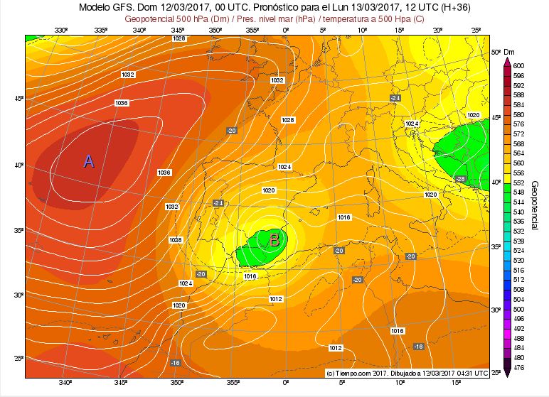 Como os comentaba más arriba, la vaguada se estrangulara, formándose una dana ( depresión aislada en niveles altos). Ayer esta dana la posicionaban frente a la costa de Valencia, en la ultima actualización ha cambiado y la centran entre Almería y Murcia. Lo mismo esta tarde noche cambia de posición. Comentaros esto es para que os deis cuenta lo difícil que es predecir este tipo de situación.