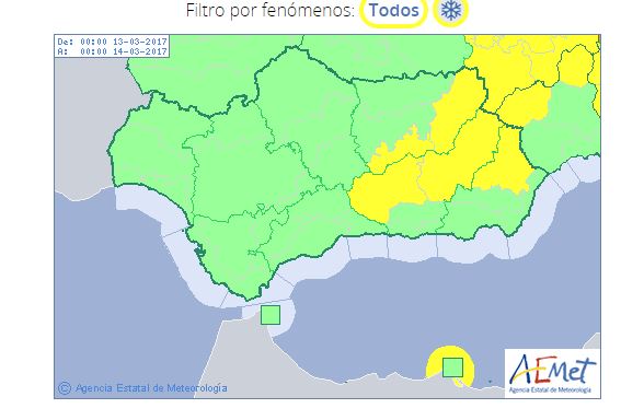 Pues si amigos de la meteo, vuelve el frío, las lluvias y el viento por unos dias a nuestra comunidad. El frío lo notaremos más mañana, incluso se esperan nevadas a cotas bajas en las provincias de Almería, Granada y Jaén, por este motivo la aemet activa el aviso amarillo por nevadas.