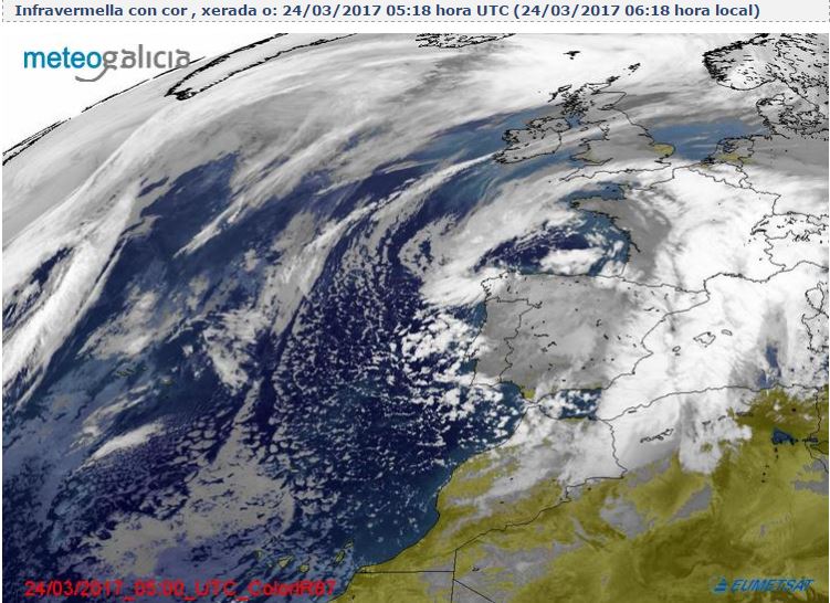 Son las seis y media de la mañana, mi estación meteorológica en Málaga Capital registra 7,8 grados, como el viento esta en calma sentimos menos frío que ayer a la misma hora. Los cielos están nubosos y la humedad ronda en estos momentos el 67 %. En lo que respecta al resto de nuestra comunidad los cielos también están nubosos, destacar los -1,3 grados que se registran en Granada Aeropuerto, y los 5,4 grados en el Aeropuerto de Málaga . Os paso las temperaturas que tenemos en estos momentos en nuestra comunidad, y la imagen del satélite eumetsat en infrarrojos. Fuente aemet, meteogalicia.