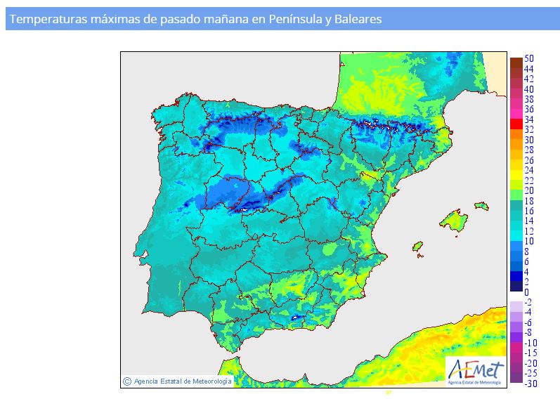 Como os comento en el titulo del post, las temperaturas máximas se irán recuperando paulatinamente. El domingo se registraran máximas mas acorde con las fechas que estamos. Os paso el mapa de temperaturas máximas previstas.