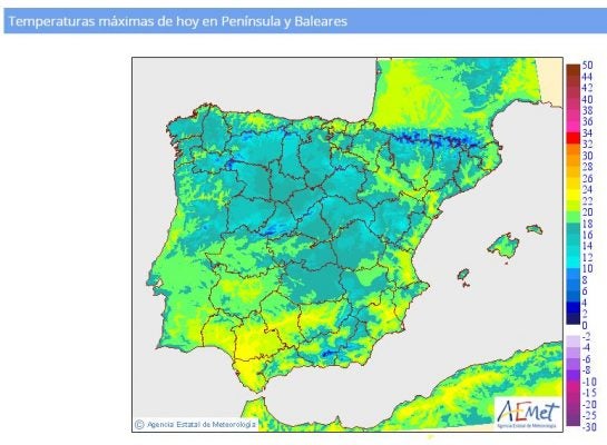 Os paso el mapa de temperaturas máximas previstas para hoy en la peninsula.
