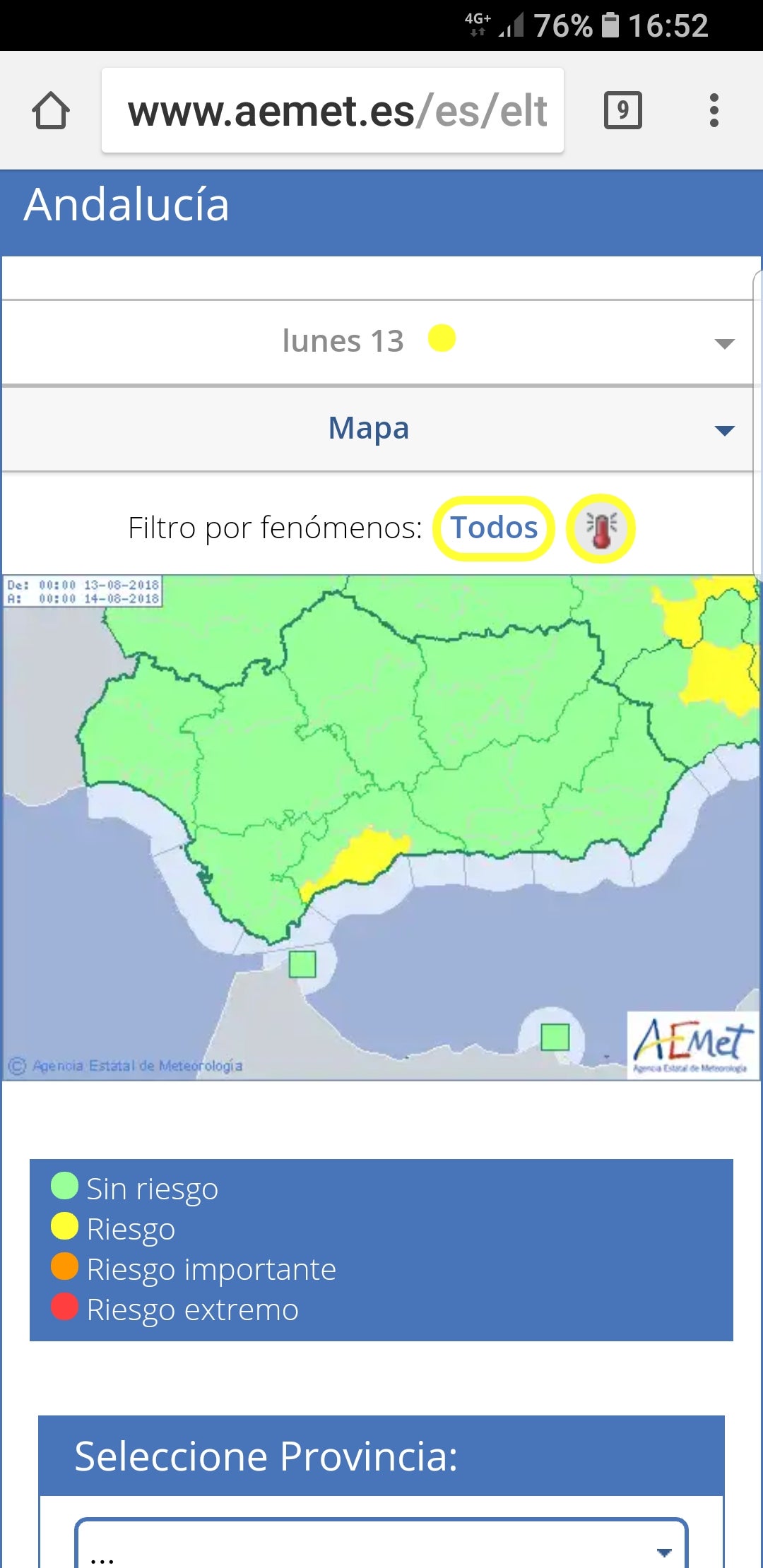 Buenas tardes amigos de la meteo. La aemet acaba de activar el aviso amarillo por altas temperaturas en el Valle del Guadalhorce, Estepona y Málaga capital ( según barrios) para mañana lunes. La máxima prevista puede llegar a los 38 grados, según pronostica la aemet. La probabilidad es del 40% al 70%. Hay probabilidad de […]