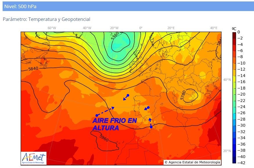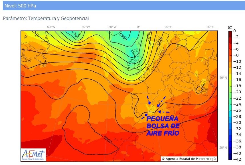 Las provincias de Granada, Almería y Jaén ( interior) entran en aviso amarillo esta tarde por tormentas, si vais por carretera por estas zonas tener mucha precaución. Estas tormentas se deberán al aire frío que tenemos en altura y que podéis ver en este mapa a 500 hpa. Fuente aemet.