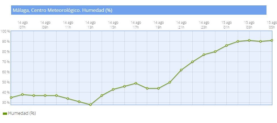 Buenos días amigos de la meteo. Cuando son las seis y media de la mañana en Málaga Capital mi estación registra 23.2 grados, los cielos están nubosos debido al levante y la humedad ronda el 90%. Os paso la gráfica de humedad del Centro Meteorológico y las temperaturas que tenemos a esta hora. Fuente aemet.