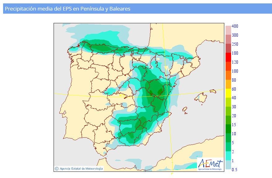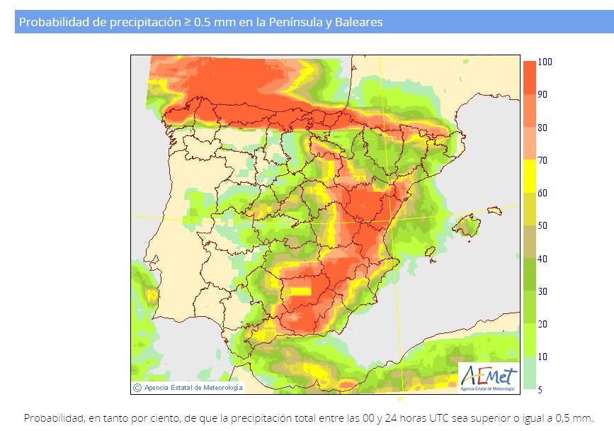 Os paso los mapas de probabilidad de precipitación y el de precipitación media. Fuente aemet.