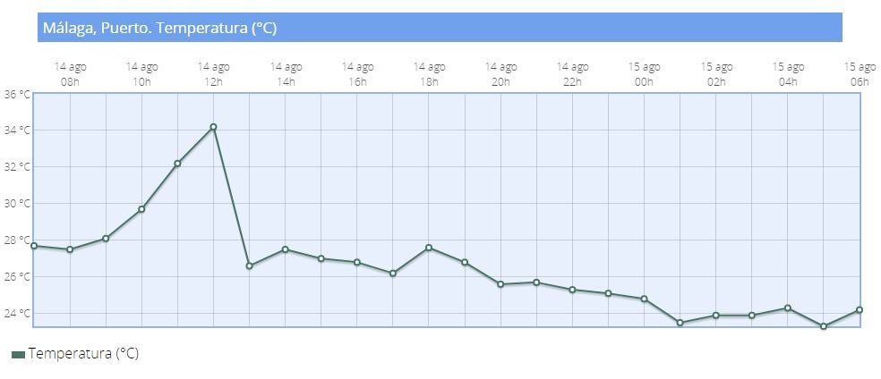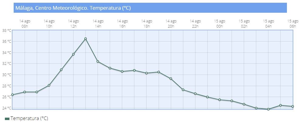 Poco más que contar amigos de la meteo. Os paso las gráficas de temperatura de ayer del Centro Meteorológico y Puerto de Málaga cuando había 11 grados de diferencia a la misma hora. El Centro Meteorológico dio una máxima de 37,7 grados. La máxima de España la dio Coín con 39.1 grados. Fuente aemet.