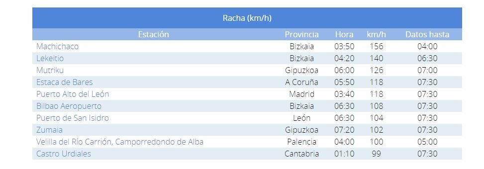 Pero donde más se esta notando las rachas fuertes de viento es en el norte de la península. En muchas boyas en estos momentos se miden olas de casi 10 metros. Os paso las rachas más fuertes que se han dado hasta la ocho de la mañana.