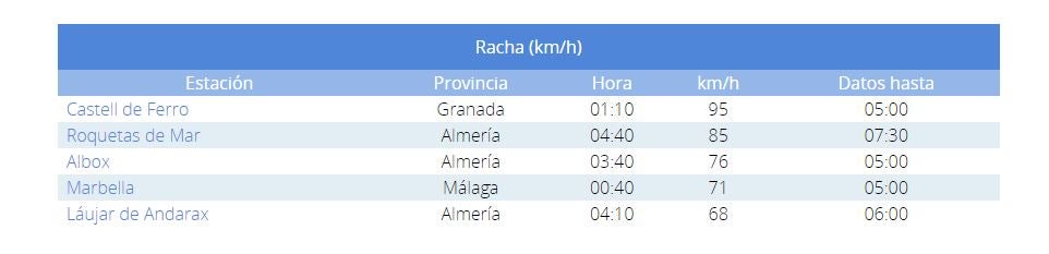 Os paso las rachas más fuertes de viento que se han dado hoy viernes hasta las ocho de la mañana en nuestra comunidad. Fuente aemet.
