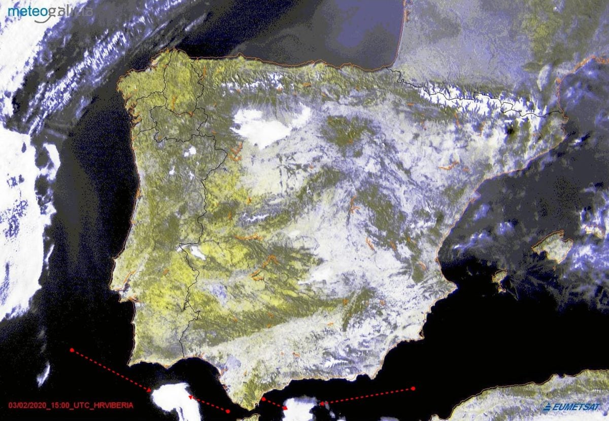 Os paso una imagen del visible del satélite eumetsat de ayer, donde se aprecia el taró ( niebla) en el Golfo de Cádiz y Mar de Alborán. Fuente meteogalicia.