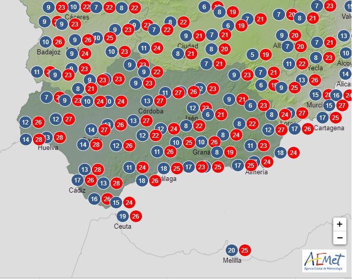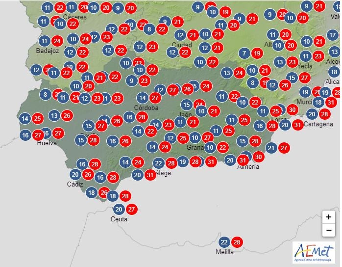 Muy buenos días, amigos de la meteo. Madrugada calurosa en la capital malagueña, la temperatura no ha bajado de 25 grados en el Aeropuerto, el culpable el terral. Lo único bueno que no se ha sudado. De momento ha sido la mínima más alta de toda la península. Hoy seguiremos con terral y en las zonas habituales de la provincia malagueña, se pueden sobrepasar los 31 o 32 grados.
