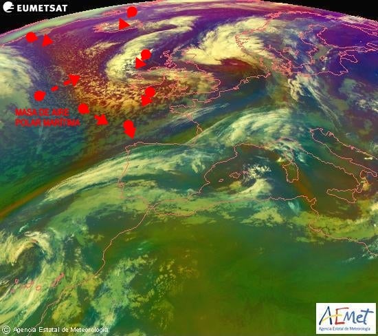 Os paso una imagen de masas de aire del satélite eumetsat. Fuente aemet.