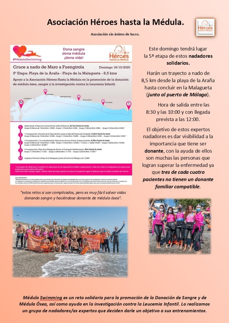 Comentaros que los amigos de la Asociación Héroes hasta la Médula están inmersos en un reto complicado pero apasionante, donde además de dar brazadas estos nadadores y nadadoras solidarios, quieren dar visibilidad a la importancia que tiene ser donante. Mañana domingo sobre las 12:00 está prevista su llegada a la Malagueta, concretamente junto a la Farola, ya pegando al puerto,si si, a nado desde la playa de la Araña, harán a nado todo el tramo, unos 8,5 kilómetros. Para todo aquel que pueda o le apetezca recibirlos, darles muestras de apoyo, o incluso si algunos queréis información, allí estarán miembros de la Asociación también para recibir a sus compañeros. Los malagueños somos solidarios y estoy seguro que tendrán una buena acogida en esta etapa que es la 5ª, aún les queda brazadas hasta llegar a su meta fijada. Si hay interesados/as en participar en este reto, habrá diferentes puntos donde poder incorporarse. El primero de ellos al inicio de la playa del Dedo, junto al puerto de El Candado, el segundo y primer avituallamiento en la playa de las Acacias y el tercero en la playa de la Malagueta frente al chiringuito Mediterráneo. Buen fin de semana.