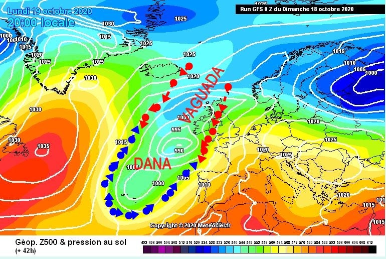 Esta dana mañana lunes interacionará con una vaguada y se formará una profunda borrasca al noroeste de Galicia el martes, como podéis apreciar en estos dos mapas que os pongo a continuación.