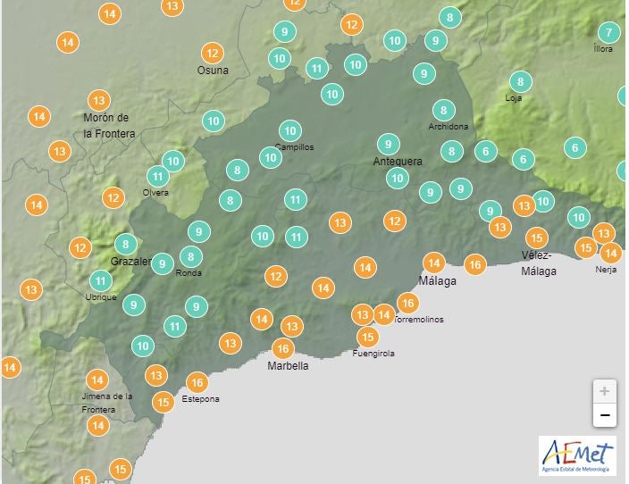 La máxima hoy en la capital malagueña rondará los 14 grados. Para mañana domingo se esperan estás máximas y mínimas por la aemet.
