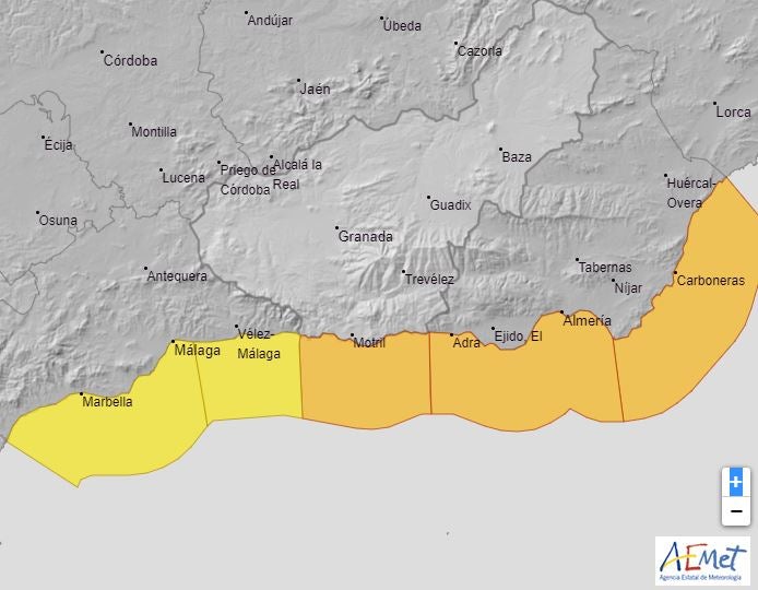 La aemet activa para el sábado en la costa de Málaga el aviso amarillo por fenómenos costeros, viento del oeste fuerza 7.  En las costas de Almería y Granada será naranja, viento del oeste noroeste fuerza 8.