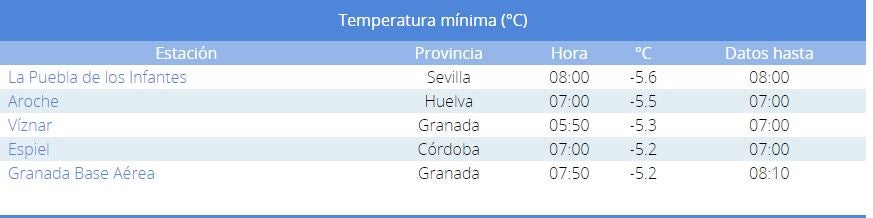 Desde hace más de una semana, los aficionados a la meteorología, estamos haciendo un seguimiento especial de una compleja situación que puede darse a partir de Reyes. Pero antes de explicaros fácilmente a que se debe este posible cambio de tiempo, os paso las temperaturas mínimas más destacadas que se han registrado en nuestra comunidad. Destacar Huelva que ha helado.