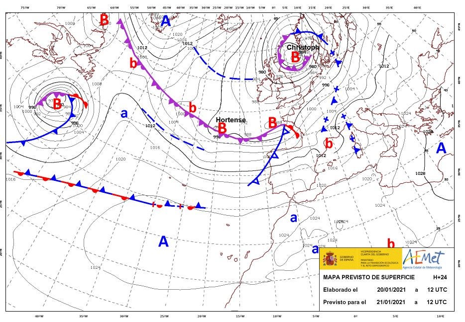La Aemet saco ayer una nota informativa comunicando que durante unos días tendremos el paso de sucesivos frentes atlánticos. También se ha puesto nombre a la octava borrasca de la temporada 2020-2021, como mucho sabéis, se llama Hortensia ( Hortense). El ponerle nombre se debe a que traerá sobre todo mañana viernes, rachas muy fuertes de viento a muchos puntos de la península y Baleares.