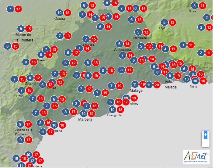 Os pongo las temperaturas máximas y mínimas que prevé la Aemet.