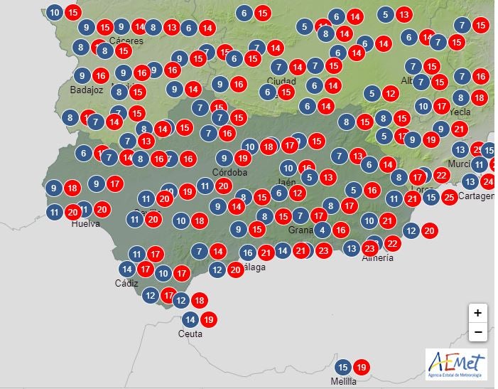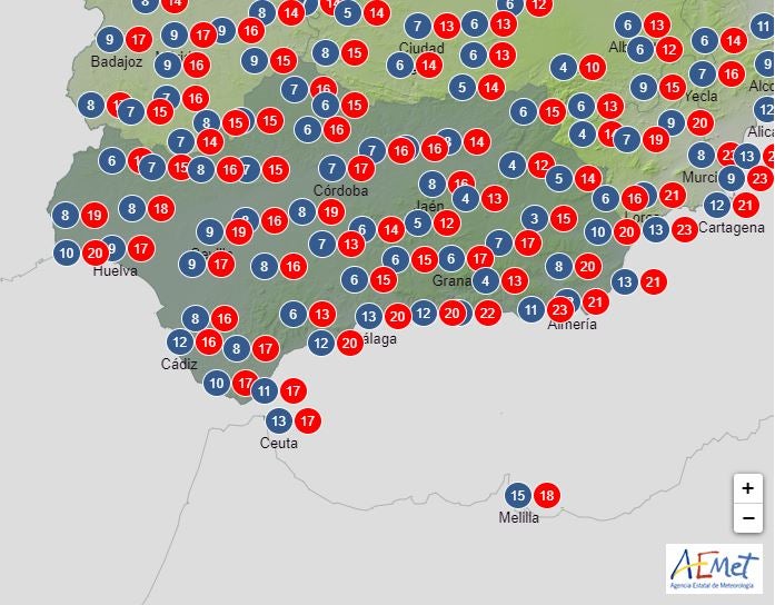 Os paso las temperaturas máximas y mínimas que prevé la aemet.