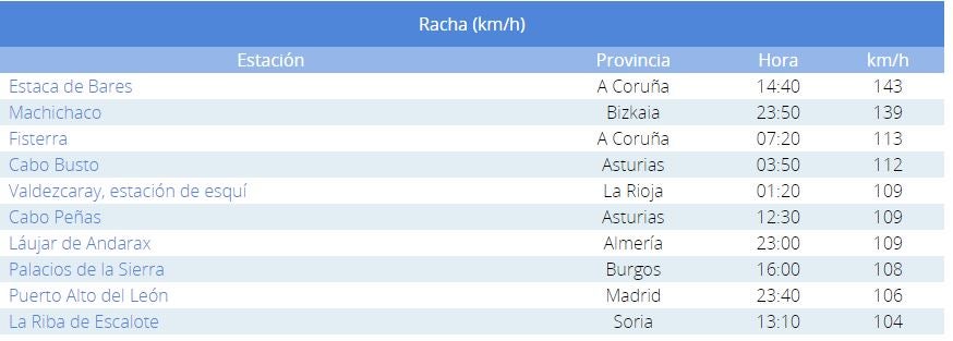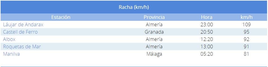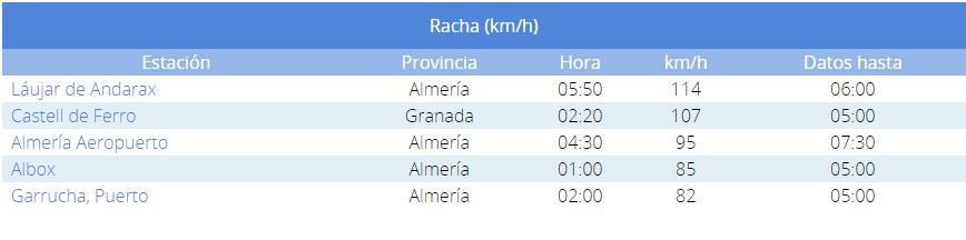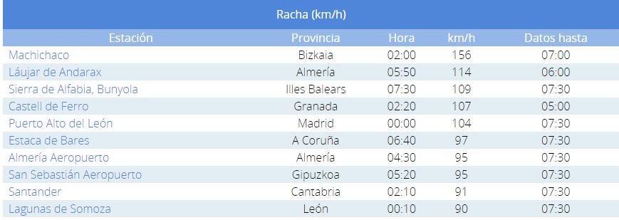 Destacar en Andalucía los 114 km/h de Láujar de Andarax, y los 156 km/h en Machichaco Bizkaia.