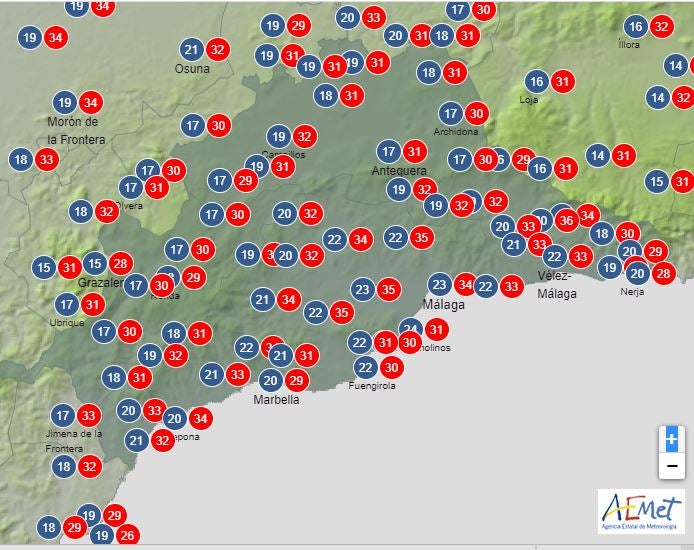 Os paso las temperaturas máximas y mínimas que prevé la aemet para la provincia malagueña.