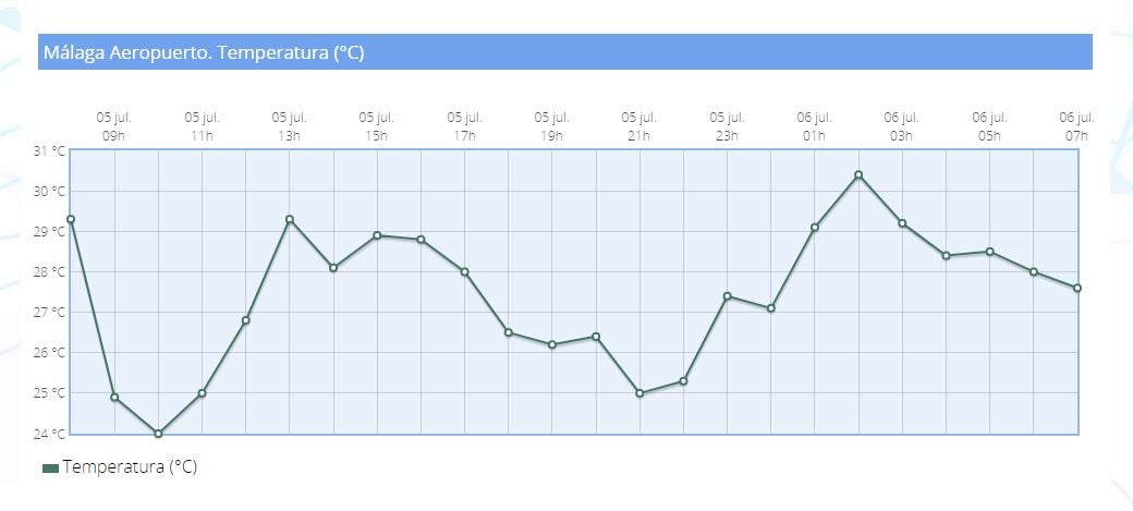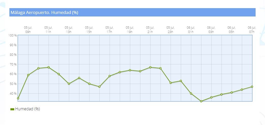 Sobre las dos de la madrugada de hoy martes, ha entrado nuevamente el terral en la capital malagueña. A esa hora llegamos a 30.4 grados, más tarde ha ido bajando y en estos momentos tenemos 28.5 grados. En estas gráficas de temperatura y humedad de la estación del Aeropuerto se ve claramente. Fuente Aemet.